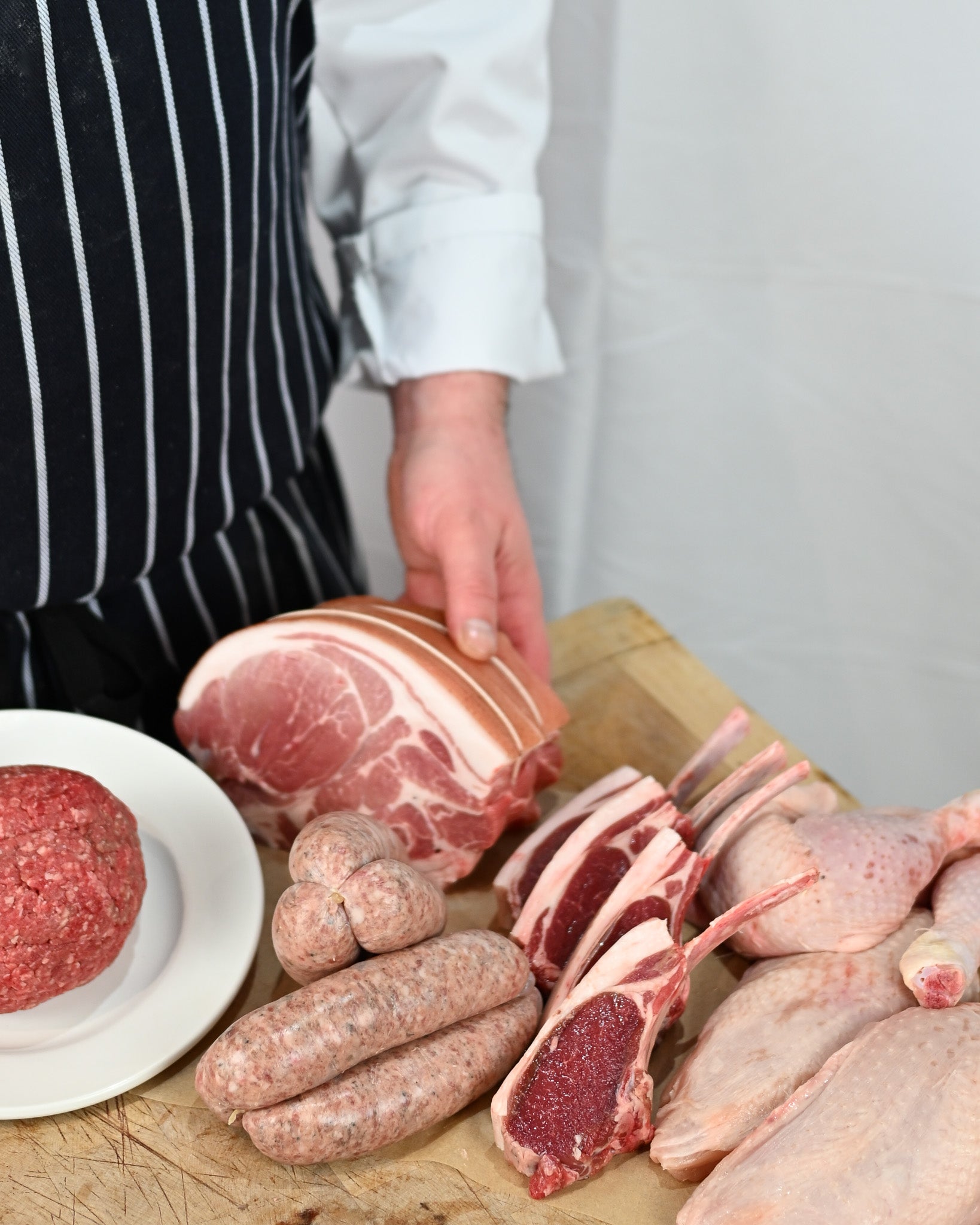 A mixed box of essentials to keep the whole family fed throughout the week. Packed with versatile, high-welfare meat including beef mince, sausages, chicken breasts, chicken legs, lamb loin chops, and a pork roasting joint — all prepared fresh at Block. Straightforward, quality ingredients for easy, satisfying meals.